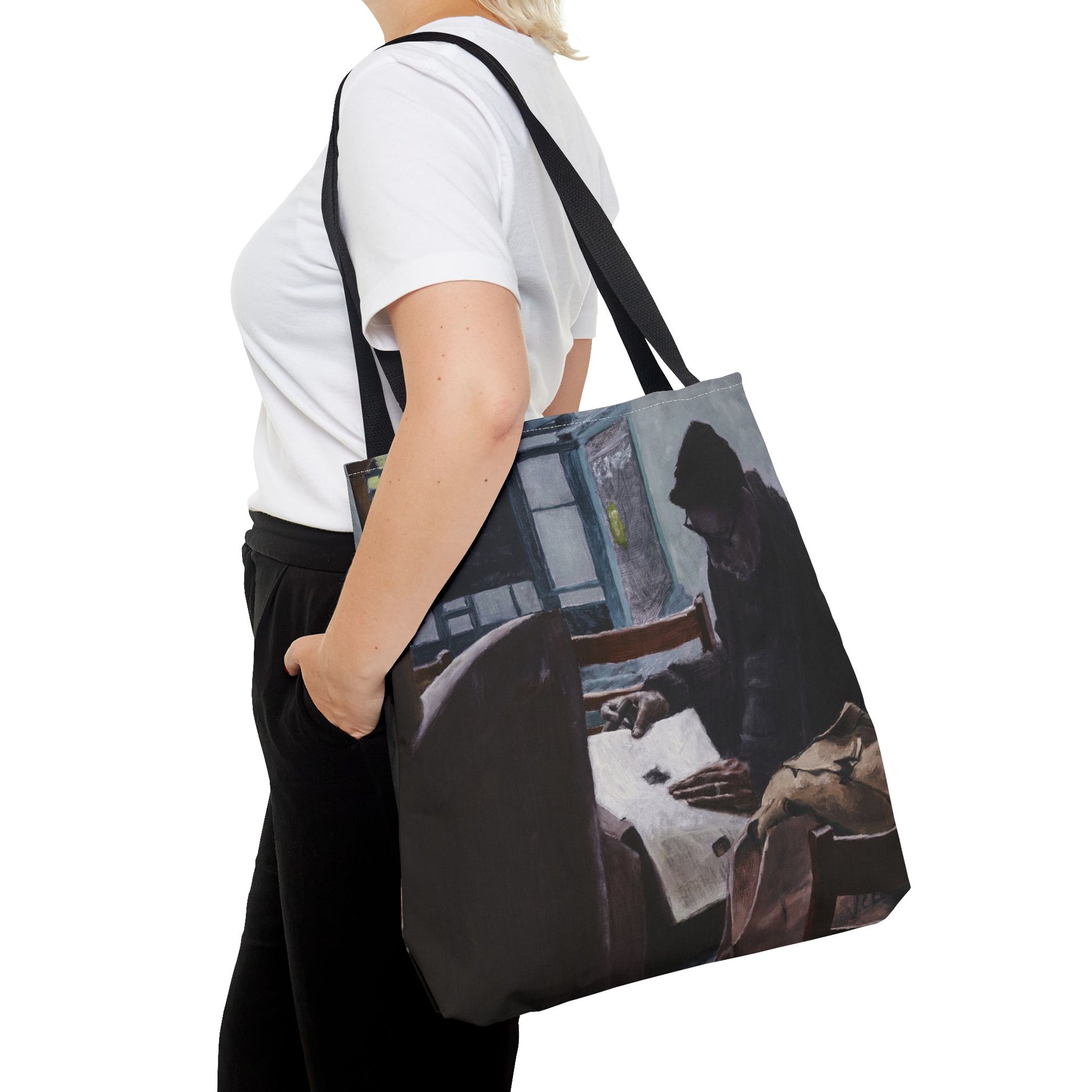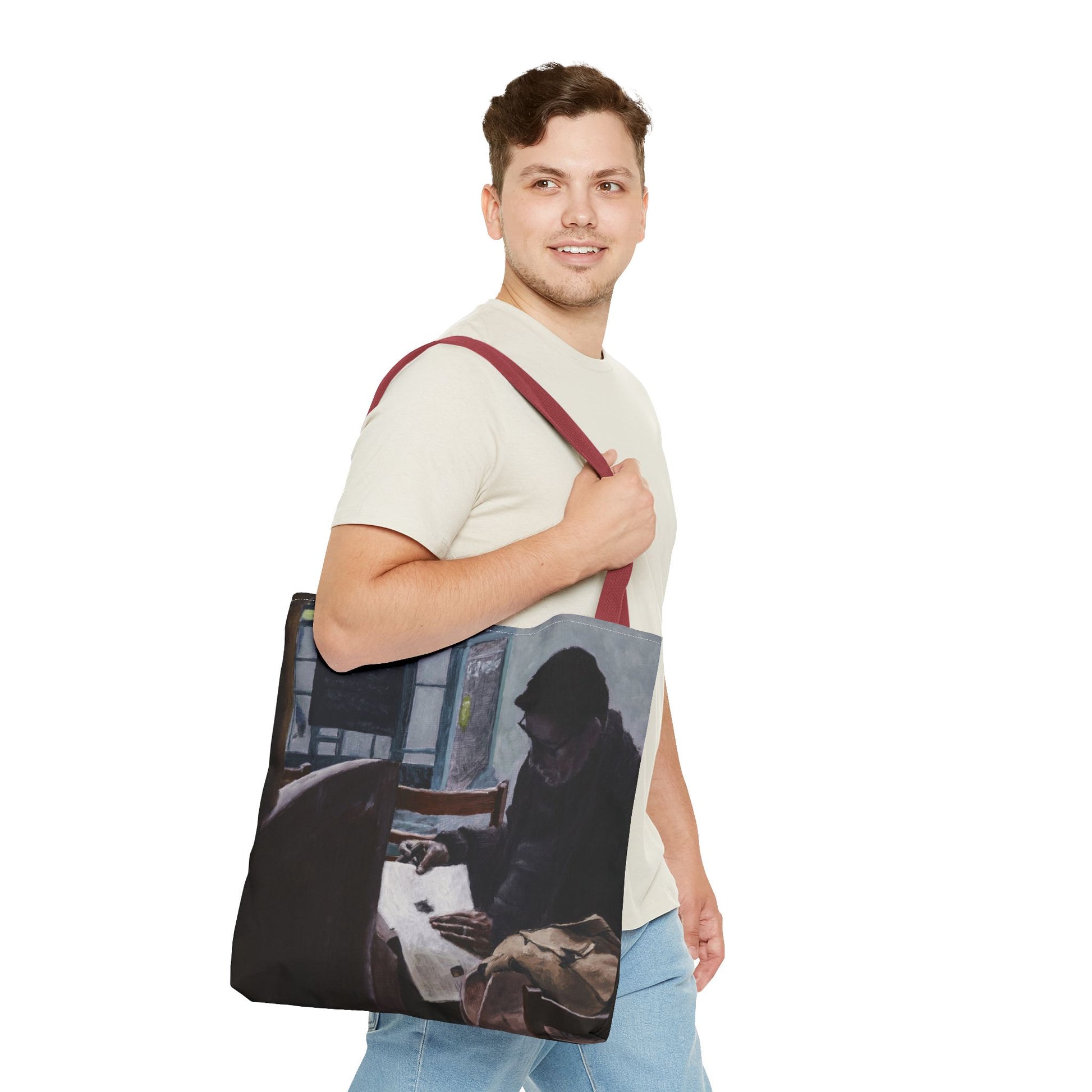 Morning light filters through a busy city window. He sits bent over the paper, cigar smoldering, lost in a small, private world amid the hum of New York. This tote carries that hush — a painted moment turned everyday companion. The soft but sturdy fabric holds your market finds, sketchbook, or commute essentials while the boxed corners give roomy depth without losing the artwork’s quiet presence. Choose a handle color that matches your mood and walk the avenues with a little gallery tucked at your side.