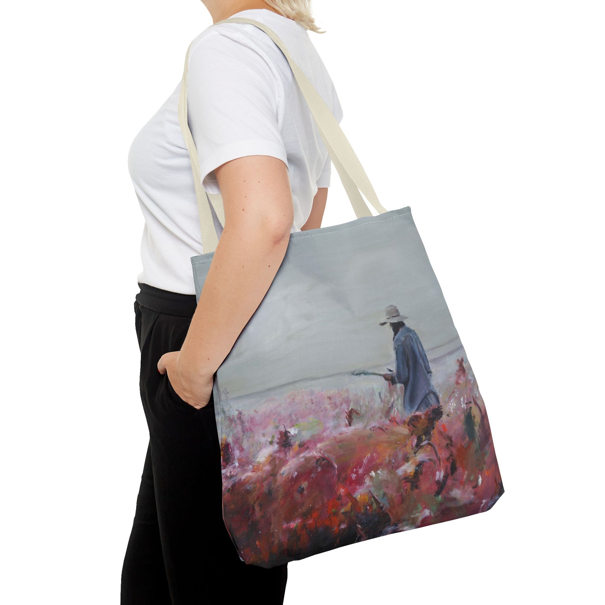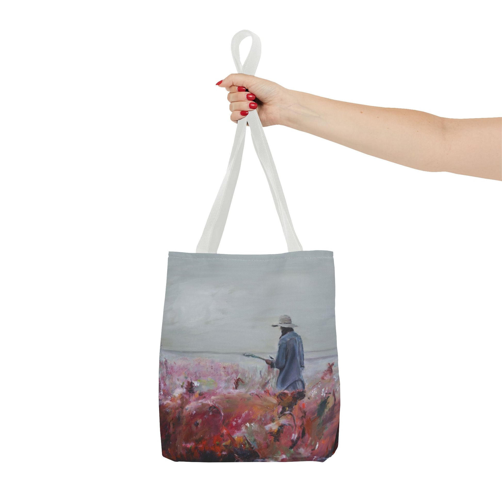 Morning light is obscured by the fog that lays over the field in this pastoral scene. The quiet of the morning as you start your day. This tote carries that hush — a painted moment turned everyday companion. The soft but sturdy fabric holds your market finds, sketchbook, or commute essentials while the boxed corners give roomy depth without losing the artwork’s quiet presence. Choose a handle color that matches your mood and walk the avenues with a little gallery tucked at your side.
